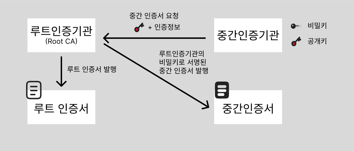 - 루트 인증기관이 CSR을 확인하고 검증된 경우 루트 인증기관의 비밀키로 서명된 중간 인증서를 발행합니다.