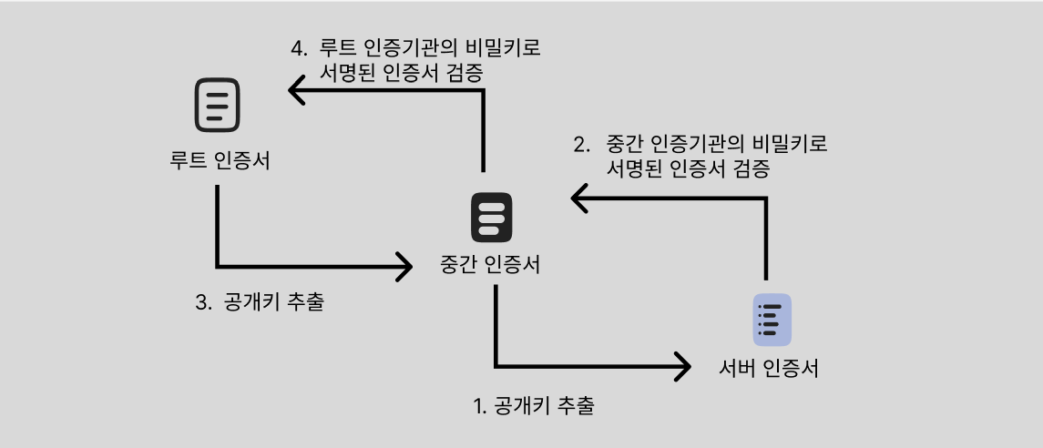 - 중간 인증서에는 중간 인증기관의 공개키가 포함되어 있습니다.